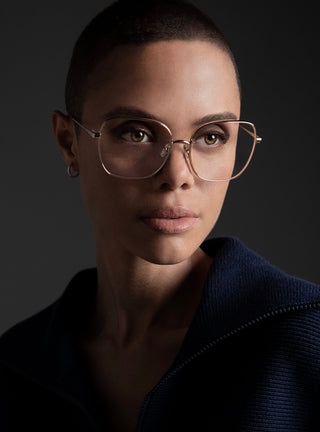 Its sculpted titanium structure is defined by a thick gold-plated rim, bringing warmth, depth, and distinction to the face.